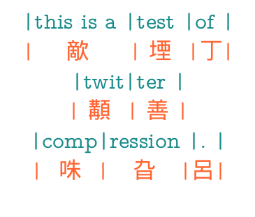 This brings me back to twitter. If you are unaware, twitter allows users to post short, 140 character messages for the rest of the world to enjoy. 140 characters is not a lot to go on. Assuming 4.5 characters per word, this means that in traditionally written english you're lucky to fit 25 words in a standard tweet. But, we know now that we can do better. In fact, if we could come up with some kind of crazy scheme to compress english in such a way as to use each of the 27 usual characters so that each of those characters appeared with roughly equal probability, we've seen that we could get 4.75 bits per character, with 140 characters and 5.5 symbols per word, this would allow us to fit not 25 words in a tweet but 120 words. A factor of 4.8 improvement. Of course we would have to discover this miraculous encryption transformation. Which to my knowledge remains undiscovered. But, we can do better. It turns out that twitter allows you to use Unicode characters in your tweets. Beyond enabling you to talk about Lagrangians (ℒ) and play cards (♣), it enables international communication, by including foreign alphabets. So, in fact we don't need to limit ourselves to the 27 commonly used English symbols. We could use a much larger alphabet, Chinese say. I choose Chinese because there are over 20,900 Chinese alphabet symbols in Unicode. Using all of these characters, we could theoretically encode 14.3 bits of information per character, with 140 characters, and 1 bit per English character, and 5.5 symbols per English word, we could theoretically fit over 365 English words in a single tweet. But alas, we would have to discover some magical encoding algorithm that could map typed English to the Chinese alphabet such that each of the Chinese symbols occurred with equal probability. I wasn't able to do that well, but I did make an attempt.