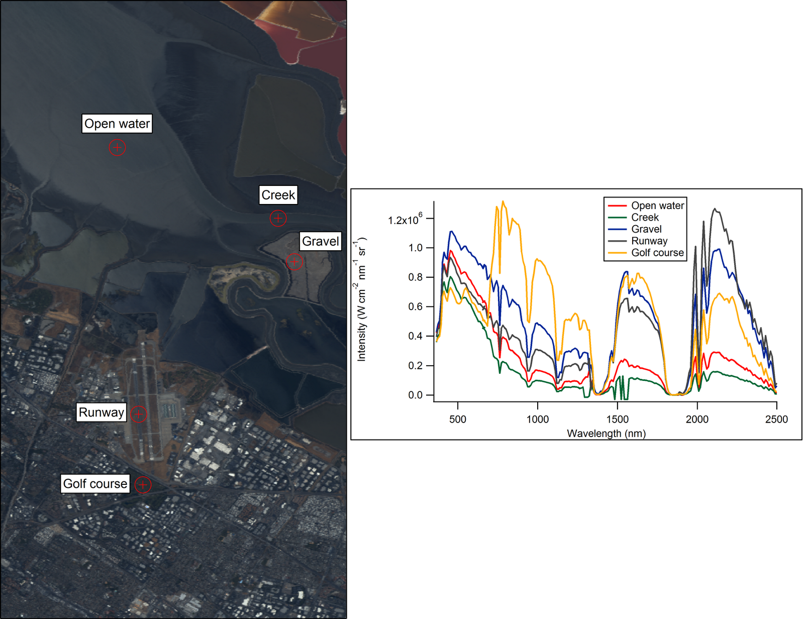 Looking at the different spectra we can see that liquid water absorbs strongly in the infrared, and the green grass on the golf course reflects strongly in the near-infrared (no clue why). There is also a clear difference in intensities for each of the locations in the visual range, but the five locations otherwise look quite similar, even though they are very different colors in real life.
