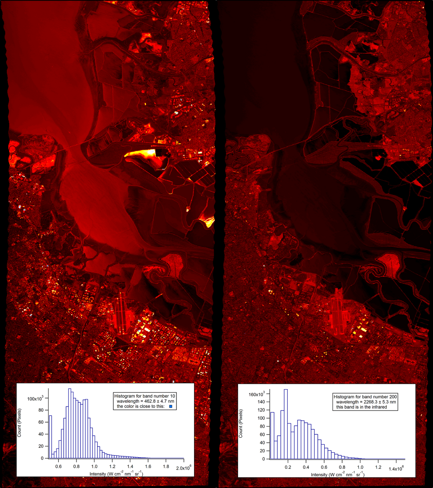 AVIRIS acts much like a normal camera, but instead of three wide-band filters for distinguishing color it uses 225 narrow bands ranging from 366 nanometers (near UV) to 2500 nanometers (near IR). Any of these bands can be thought of as a single monochromatic image. Here I have plotted two bands side by side for comparison. The right image is at 463 nanometers (a nice blue color) and the other is at 2268 nanometers, well into the infrared. (Both images are false-colored to enhance the contrast).