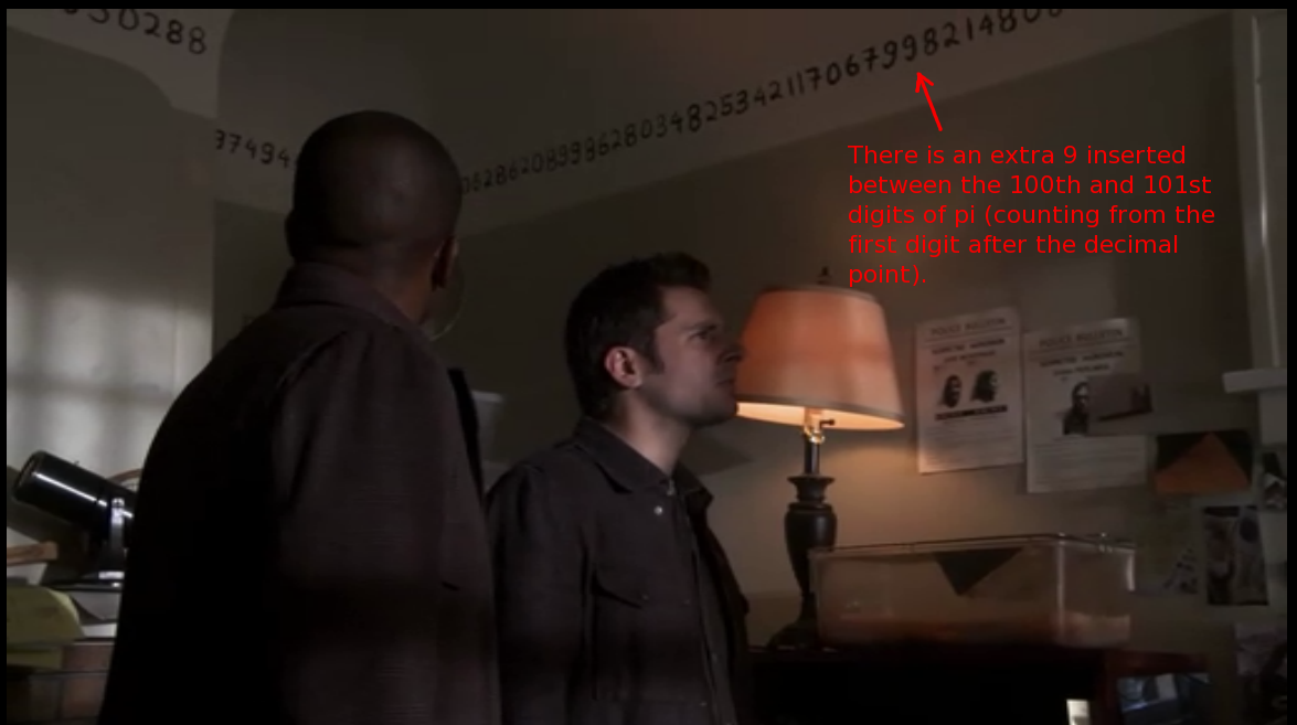 Today, as I'm sure you're aware, is Pi Day - a day for the festive consumption of pies and quiet self-reflection. In the spirit of the holiday, I'd like to present a point for discussion: Everyone has a great talent for at least one thing. That this is true for at least some people is seen through even a cursory glance at a history book: George Washington was really good at leading revolutions, Michelangelo was an outstanding ceiling painter [1], and Batman was the best at solving complex riddles (especially in English, pero especialmente en español). But I'm certain that this holds for everyone. What's your talent? Mine, as those of you who read this blog should know very well by now, is certainly not doing physics. Nope, my talent is watching TV. Seriously guys, I watch TV like a boss [2]. In light of this talent, I thought I would describe a few instances in which I have seen pi represented (for better or for worse) in TV and movies. Over the last few months, I have been re-watching a lot of the TV show Psych with my good friend and fellow Virtuosi contributor, Matt "TT" Showbiz [3]. For the uninitiated, Psych is a detective show where the main characters (Shawn and Gus) run a (fake) psychic detective agency, which allows them to solve mysteries, engage in various shenanigans, and make an inordinate number of references to Tears for Fears frontman Curt Smith [4]. In one of the episodes, Shawn and Gus enter a room where a long train of digits is written across the top of the wall. It soon becomes evident that these are the digits of pi and the camera is sure to zoom in on the famous first few digits to reassure us. But there are hundreds of digits written out and I have very little faith in TV prop people when it comes to background mathematical expressions. So I decided to check it out.