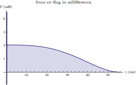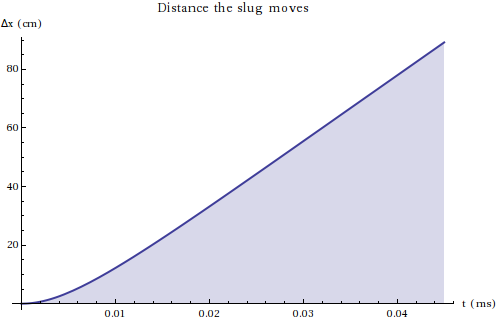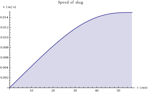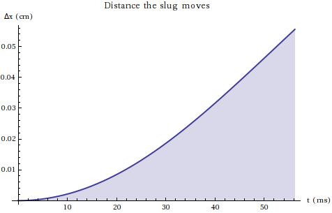 This is starting to look a lot more like a Railgun, unfortunately, it would draw a current of 15 MA to start! So the real question becomes, how much current can you dump into a copper wire in 0.1 ms or so. 15 MA is a lot and would certainly melt the wire, but would it melt the wire in such a short time? If not, then it looks like we could get some real kick out of our model. In fact, we know that railguns with some kick can be made. According to Wikipedia, the US Navy has a railgun that can accelerate a 3.2 kg projectile at 7 times the speed of sound (\~2.3 km/s). Playing with my code, if I put in by hand a projectile mass of 3.2 kg, and reduce f to 1 (meaning we get a little more kick but our approximation of the field starts to really break down), I can get a final speed of about 2 km/s, which seems to be in relatively good agreement, but this only occurs if the current is \~100 MA for about 30 microseconds. Moral of the story, if you want to build a railgun, you need to be willing to melt some copper. Attached is a Mathematica notebook used for the computation: here.