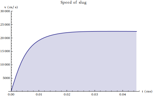 These coupled nonlinear differential equations are not easily solved, but by taking the time to nondimensionalize them, we can integrate them numerically. Lets suppose our rails are separated by 1 cm, and our f is taken to be 10 or so (remember the larger f, the better our approximation for the field). And for our material properties, lets take gauge 0 copper wire, i.e. I will use its radius, mass density, and conductivity at room temperature. Lets make the voltage supply be a kilovolt (non unreasonable), and lets choose the limiting resistor in order to keep the current in the gauge 0 wire under its specification: 170 amps. Doing all of this, we have $$ \beta \approx 5.4 \times 10^{-7} $$ $$ f = 10 $$ and for interest our characteristic time is 112 microseconds or so, the mass of our slug is about 5 grams. Our average magnetic field is about 0.07 gauss/amp between the rails, so that our starting field is about 12 gauss.
