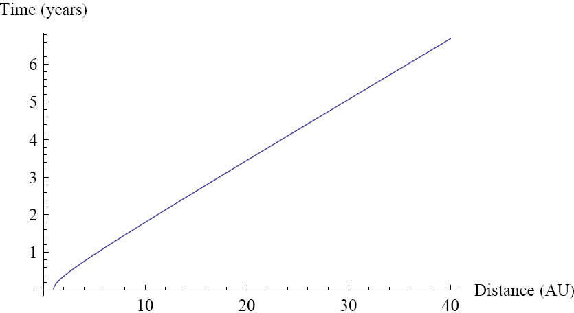 A plot of t vs. r is shown below for typical solar system distances and