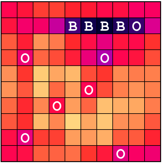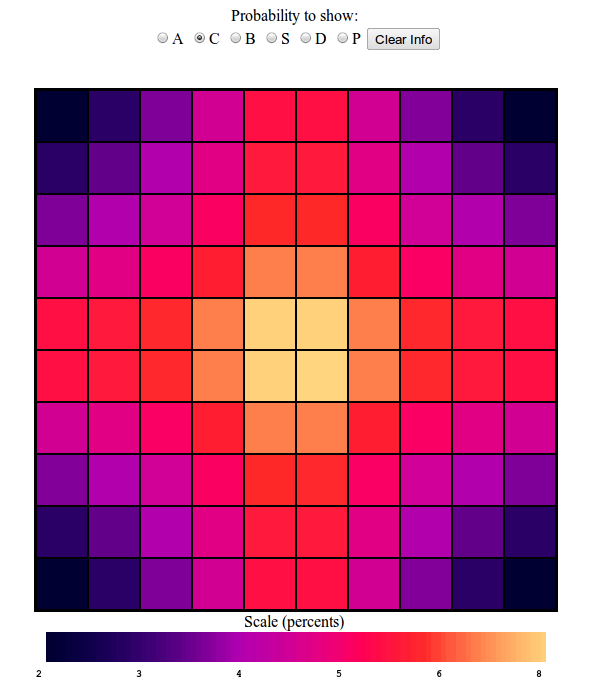 In the end, this is exactly what I did. I had my computer create billions of different battleship boards, and figure out what the proper values of B and W should be for every square of the matrix. I put all of those results together in a way that I hope is easy to explore up at the Fancy Battleship Results Page, where you are free to explore all of the results yourself. In fact, the way it's set up, you can even use the Superduper Results Page as a sort of Battleship Cheat Sheet. Have it open while you play a game of battleship, and it will show you the probabilities associated with all of the squares, helping you make your next guess. I've used the page while playing a few games of battleship online, and have had some success, winning 9 of the 10 games I played against the computer player. Of course, this linear theory isn't everything...