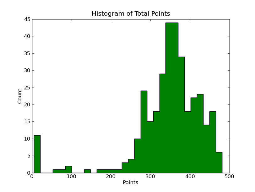 Above is a histogram of the random strategies' scores. Not so good. Looks like humans playing the game are better than randomly guessing.