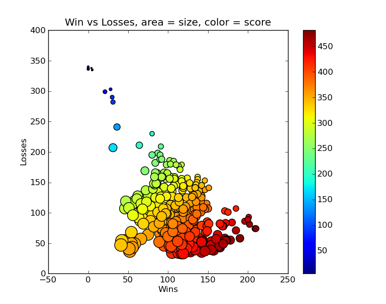 Similar plot as above but this time, x coordinate is Wins, Y is ties, size is losses and color score.