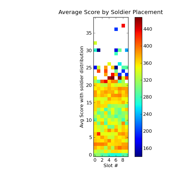 In this plot, I again went through all of the strategies in the database, and this time, every square reflects the average score for all strategies that have that many soldiers (y axis) in that slot (x axis).