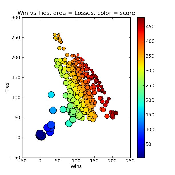 This scatter plot has a point for each strategy in the database, the x coordinate giving its number of wins, the y coordinate its number of losses. The area of the circle is scaled to its number of ties, and the color is scaled to its total score. Is there a clear trend? Why does it fan out?