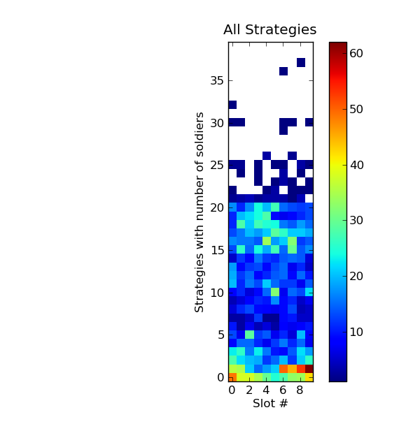 This plot is fun. It shows the full distribution of all of the strategies. I went through the database, and for every strategy, added one to the box that held true. I.e. for each slot (the slots are along the x axis), the y axis marks how many strategies in the database have that many soldiers in that slot. Should be fun to try and think about what the non-uniformities mean. Colorbar is on the side to make the colors quantitative.
